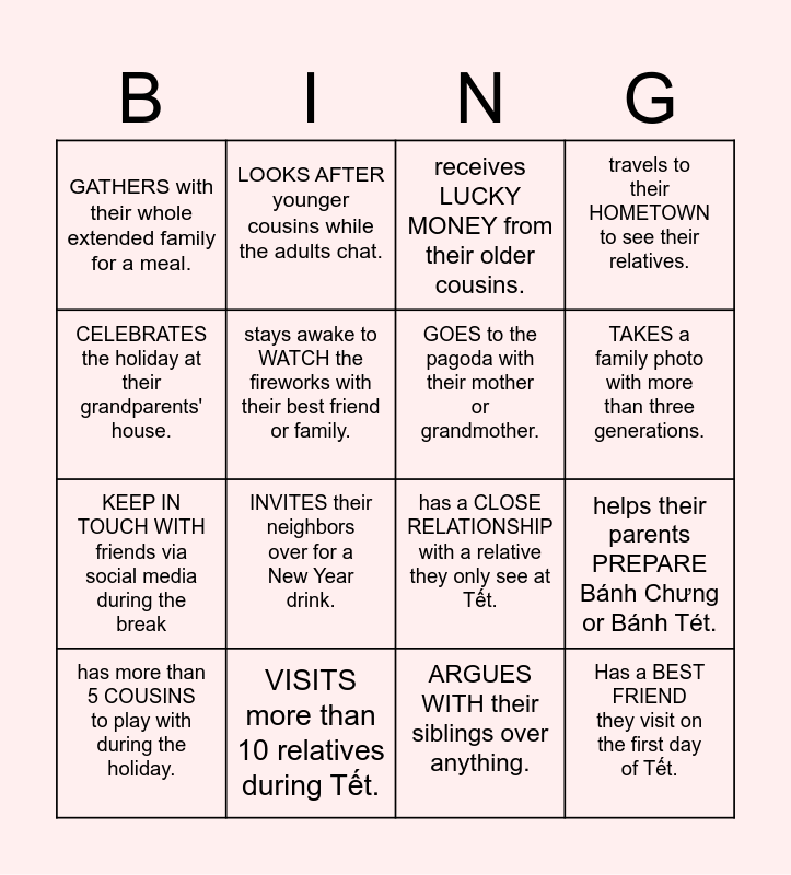 This bingo card has 16 words: VISITS more than 10 relatives during Tết., helps their parents PREPARE Bánh Chưng or Bánh Tét., receives LUCKY MONEY from their older cousins., GATHERS with their whole extended family for a meal., KEEP IN TOUCH WITH friends via social media during the break, LOOKS AFTER younger cousins while the adults chat., has a CLOSE RELATIONSHIP with a relative they only see at Tết., ARGUES WITH their siblings over anything., CELEBRATES the holiday at their grandparents' house., stays awake to WATCH the fireworks with their best friend or family., has more than 5 COUSINS to play with during the holiday., travels to their HOMETOWN to see their relatives., INVITES their neighbors over for a New Year drink., TAKES a family photo with more than three generations., GOES to the pagoda with their mother or grandmother. and Has a BEST FRIEND they visit on the first day of Tết..