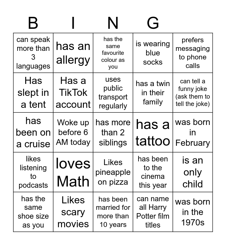 This bingo card has 30 words: Likes scary movies, has changed their career, Woke up before 6 AM today, has lived in more than 3 different countries, can speak more than 3 languages, has the same favourite colour as you, Has a TikTok account, Likes pineapple on pizza, has a tattoo, has been married for more than 10 years, was born in February, has more than 2 siblings, can name all Harry Potter film titles, was born in the 1970s, can tell a funny joke (ask them to tell the joke), has broken a bone, has been to the cinema this year, likes listening to podcasts, loves Math, prefers messaging to phone calls, has been on a cruise, prefers cats over dogs, has an allergy, has a twin in their family, Has slept in a tent, is wearing blue socks, is an only child, has the same shoe size as you, uses public transport regularly and has the same favourite food as you.