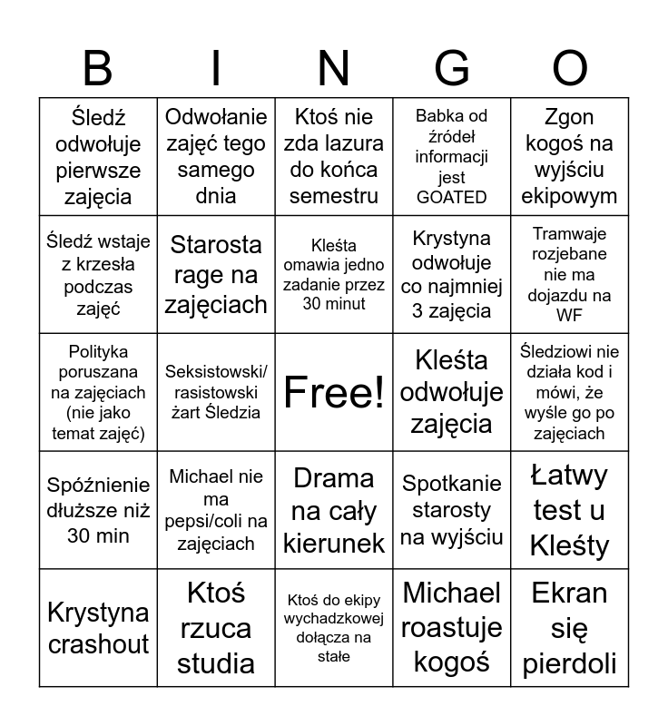 This bingo card has a free space and 24 words: Michael nie ma pepsi/coli na zajęciach, Ktoś rzuca studia, Kleśta omawia jedno zadanie przez 30 minut, Krystyna crashout, Zgon kogoś na wyjściu ekipowym, Śledź odwołuje pierwsze zajęcia, Śledź wstaje z krzesła podczas zajęć, Odwołanie zajęć tego samego dnia, Kleśta odwołuje zajęcia, Drama na cały kierunek, Krystyna odwołuje co najmniej 3 zajęcia, Polityka poruszana na zajęciach (nie jako temat zajęć), Spotkanie starosty na wyjściu, Łatwy test u Kleśty, Starosta rage na zajęciach, Michael roastuje kogoś, Śledziowi nie działa kod i mówi, że wyśle go po zajęciach, Ktoś nie zda lazura do końca semestru, Tramwaje rozjebane nie ma dojazdu na WF, Seksistowski/ rasistowski żart Śledzia, Ekran się pierdoli, Spóźnienie dłuższe niż 30 min, Babka od źródeł informacji jest GOATED and Ktoś do ekipy wychadzkowej dołącza na stałe.