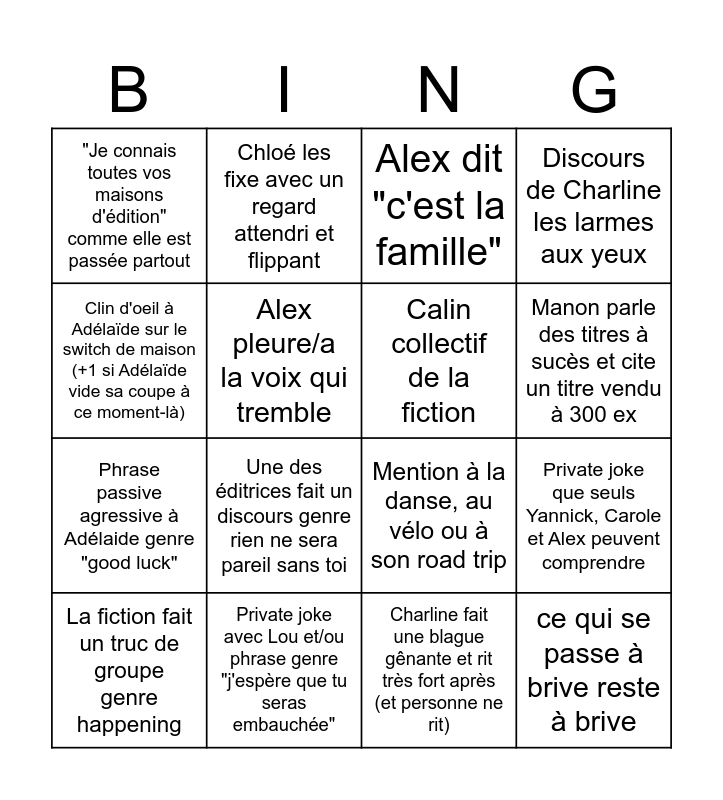 This bingo card has 16 words: Private joke avec Lou et/ou phrase genre "j'espère que tu seras embauchée", Private joke que seuls Yannick, Carole et Alex peuvent comprendre, Alex dit "c'est la famille", "Je connais toutes vos maisons d'édition" comme elle est passée partout, Phrase passive agressive à Adélaide genre "good luck", Chloé les fixe avec un regard attendri et flippant, Mention à la danse, au vélo ou à son road trip, Charline fait une blague gênante et rit très fort après (et personne ne rit), Clin d'oeil à Adélaïde sur le switch de maison (+1 si Adélaïde vide sa coupe à ce moment-là), Alex pleure/a la voix qui tremble, La fiction fait un truc de groupe genre happening, Discours de Charline les larmes aux yeux, Une des éditrices fait un discours genre rien ne sera pareil sans toi, Manon parle des titres à sucès et cite un titre vendu à 300 ex, Calin collectif de la fiction and ce qui se passe à brive reste à brive.
