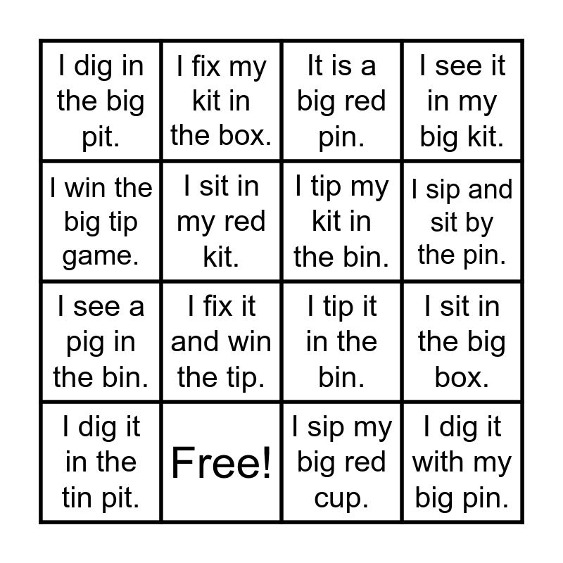 This bingo card has 16 words: Free!, I sit in the big box., It is a big red pin., I dig in the big pit., I see a pig in the bin., I fix my kit in the box., I tip it in the bin., I sip my big red cup., I win the big tip game., I sit in my red kit., I dig it in the tin pit., I see it in my big kit., I fix it and win the tip., I sip and sit by the pin., I tip my kit in the bin. and I dig it with my big pin..