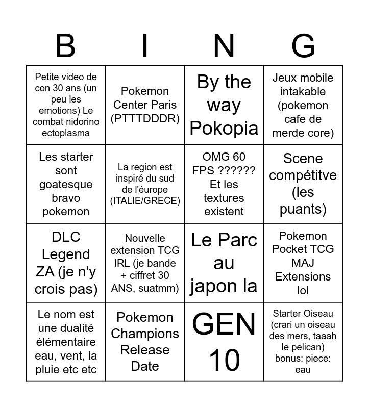 This bingo card has 16 words: Pokemon Champions Release Date, Pokemon Pocket TCG MAJ Extensions lol, By the way Pokopia, Petite video de con 30 ans (un peu les emotions) Le combat nidorino ectoplasma, DLC Legend ZA (je n'y crois pas), Pokemon Center Paris (PTTTDDDR), Le Parc au japon la, GEN 10, Les starter sont goatesque bravo pokemon, La region est inspiré du sud de l'éurope (ITALIE/GRECE), Le nom est une dualité élémentaire eau, vent, la pluie etc etc, Jeux mobile intakable (pokemon cafe de merde core), Nouvelle extension TCG IRL (je bande + ciffret 30 ANS, suatmm), Scene compétitve (les puants), OMG 60 FPS ?????? Et les textures existent and Starter Oiseau (crari un oiseau des mers, taaah le pelican) bonus: piece: eau.