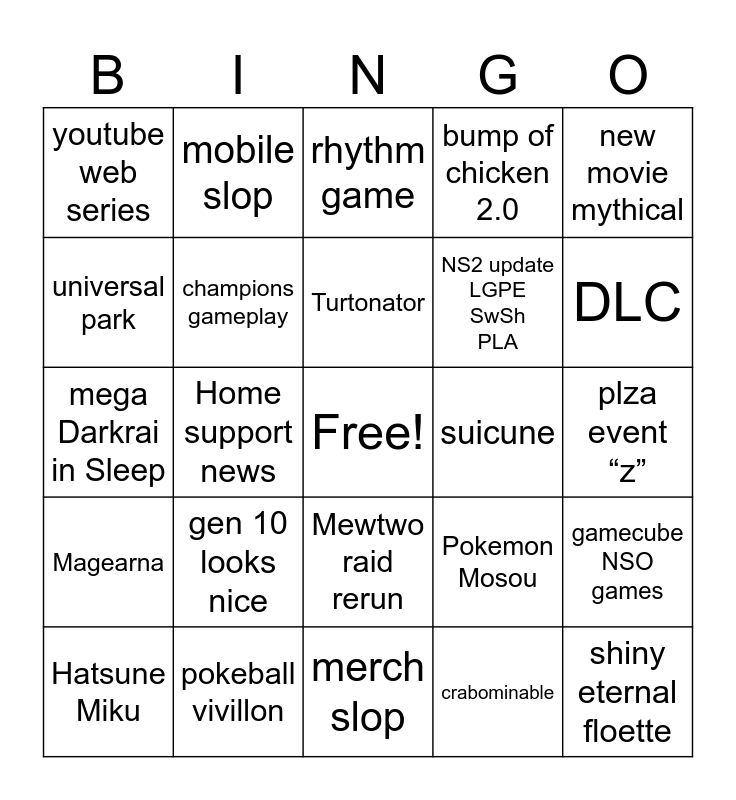 This bingo card has a free space and 24 words: gen 10 looks nice, pokeball vivillon, Turtonator, Hatsune Miku, new movie mythical, youtube web series, universal park, mobile slop, suicune, Mewtwo raid rerun, NS2 update LGPE SwSh PLA, mega Darkrai in Sleep, Pokemon Mosou, gamecube NSO games, champions gameplay, crabominable, plza event āzā, rhythm game, DLC, Home support news, shiny eternal floette, Magearna, bump of chicken 2.0 and merch slop.