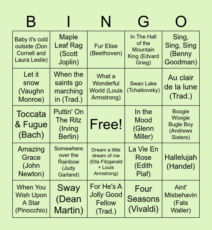 This bingo card has a free space and 24 words: Somewhere over the Rainbow (Judy Garland), Sway (Dean Martin), What a Wonderful World (Louis Armstrong), When You Wish Upon A Star (Pinocchio), Sing, Sing, Sing (Benny Goodman), Baby it's cold outside (Don Cornell and Laura Leslie), Let it snow (Vaughn Monroe), Maple Leaf Rag (Scott Joplin), In the Mood (Glenn Miller), Dream a little dream of me (Ella Fitzgerald + Louis Armstrong), Swan Lake (Tchaikovsky), Toccata & Fugue (Bach), La Vie En Rose (Edith Piaf), Hallelujah (Handel), When the saints go marching in (Trad.), Four Seasons (Vivaldi), Boogie Woogie Bugle Boy (Andrews Sisters), Fur Elise (Beethoven), Au clair de la lune (Trad.), Puttin' On The Ritz (Irving Berlin), Aint' Misbehavin (Fats Waller), Amazing Grace (John Newton), In The Hall of the Mountain King (Edvard Grieg) and For He's A Jolly Good Fellow (Trad.).