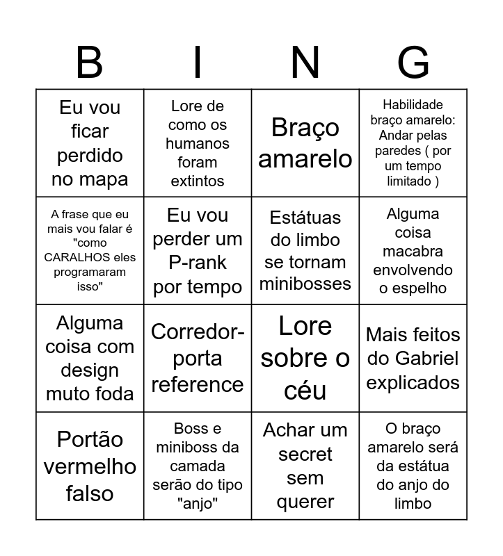 This bingo card has 16 words: Portão vermelho falso, Boss e miniboss da camada serão do tipo "anjo", Braço amarelo, Habilidade braço amarelo: Andar pelas paredes ( por um tempo limitado ), A frase que eu mais vou falar é "como CARALHOS eles programaram isso", Lore de como os humanos foram extintos, Lore sobre o céu, Mais feitos do Gabriel explicados, Eu vou ficar perdido no mapa, Eu vou perder um P-rank por tempo, Achar um secret sem querer, Alguma coisa macabra envolvendo o espelho, Alguma coisa com design muto foda, Corredor-porta reference, Estátuas do limbo se tornam minibosses and O braço amarelo será da estátua do anjo do limbo.