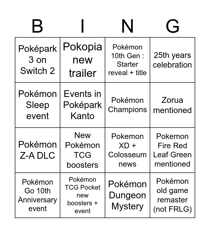 This bingo card has 16 words: Pokémon Go 10th Anniversary event, Pokémon TCG Pocket new boosters + event, Pokémon 10th Gen : Starter reveal + title, 25th years celebration, Pokémon Sleep event, Pokopia new trailer, Pokemon XD + Colosseum news, Pokemon Fire Red Leaf Green mentioned, Poképark 3 on Switch 2, Events in Poképark Kanto, Pokémon Dungeon Mystery, Zorua mentioned, Pokémon Z-A DLC, New Pokémon TCG boosters, Pokémon Champions and Pokémon old game remaster (not FRLG).