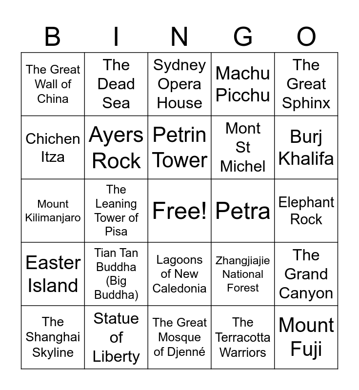 This bingo card has a free space and 30 words: Statue of Liberty, The Eiffel Tower, The Leaning Tower of Pisa, Sagrada Familia, The Great Wall of China, Sydney Opera House, Ayers Rock, Lagoons of New Caledonia, Petra, The Great Mosque of Djenné, Elephant Rock, Mount Fuji, The Terracotta Warriors, Iguazú Falls, Burj Khalifa, Stonehenge, Zhangjiajie National Forest, Easter Island, Tian Tan Buddha (Big Buddha), The Great Sphinx, Mount Kilimanjaro, Christ the Redeemer, The Dead Sea, Mont St Michel, Chichen Itza, Machu Picchu, The Grand Canyon, The Shanghai Skyline, Petrin Tower and Taj Mahal.
