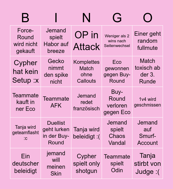 This bingo card has a free space and 24 words: Duellist geht lurken in der Buy-Round, jemand will meinen Skin, Komplettes Match ohne Callouts, Ein deutscher beleidigt, Einer geht random fullmute, Force-Round wird nicht gekauft, Cypher hat kein Setup :x, Jemand spielt Habor auf breeze, Buy-Round verloren gegen Eco, Tanja wird beleidigt :(, Eco gewonnen gegen Buy-Round, Teammate kauft in ner Eco, Jemand spielt Chaos Vandal, Jemand auf Smurf-Account, Gecko nimmt den spike nicht, Teammate spielt Odin, 1v4 wird geschmissen, OP in Attack, Match toxisch ab der 3. Runde, Teammate AFK, Tanja stirbt von Judge :(, Tanja wird geteamflasht :c, Weniger als 2 wins nach Seitenwechsel and Cypher spielt only shotgun.