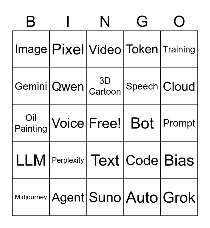 This bingo card has a free space and 70 words: AI, Prompt, Chatbot, Model, Agent, Copilot, Token, Data, Training, Test, Bias, Vision, Image, Video, Audio, Voice, Text, Speech, NLP, LLM, Bot, Code, Cloud, App, Tool, Search, Chat, Task, Auto, Robot, Pixel, Prompting, Algorithm, Feature, Output, Input, Context, Memory, ChatGPT, Gemini, Claude, Perplexity, Grok, Meta AI, DeepSeek, Qwen, Midjourney, DALL·E, Banana, Adobe Firefly, Canva AI, Runway, NotebookLM, Google AI Studio, Suno, Realistic, 3D Cartoon, Pixar-style, Anime, Watercolor, Oil Painting, Flat Design, Isometric, Cyberpunk, Computer Vision, Speech to Text, Text to Speech, Text to Image, Text to Video and Big Data.