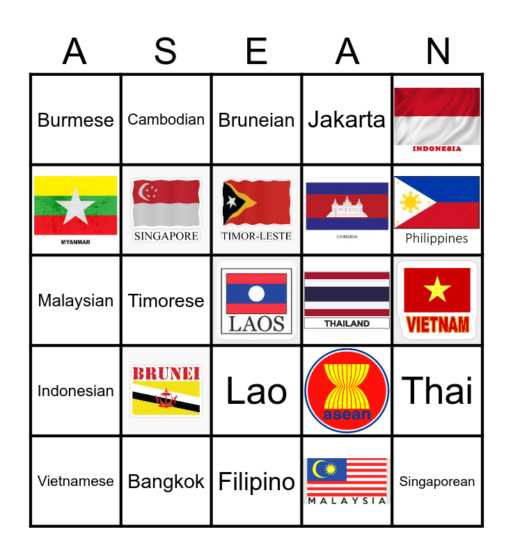 This bingo card has 12 images and 13 words: Filipino, Vietnamese, Burmese, Cambodian, Lao, Malaysian, Thai, Singaporean, Bruneian, Timorese, Bangkok, Indonesian and Jakarta.