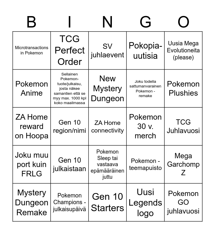 This bingo card has 25 words: Gen 10 julkaistaan, Gen 10 Starters, New Mystery Dungeon, Mystery Dungeon Remake, Uusia Mega Evolutioneita (please), Microtransactions in Pokemon, Pokemon Anime, TCG Perfect Order, Pokemon 30 v. merch, Pokemon Sleep tai vastaava epämääräinen juttu, Joku todella sattumanvarainen Pokemon -remake, ZA Home reward on Hoopa, Pokemon -teemapuisto, Mega Garchomp Z, Sellainen Pokemon-tuote/julkaisu, josta näkee samantien että se myy max. 1000 kpl koko maailmassa, Pokemon GO juhlavuosi, TCG Juhlavuosi, SV juhlaevent, Pokemon Plushies, Gen 10 region/nimi, ZA Home connectivity, Pokemon Champions -julkaisupäivä, Joku muu port kuin FRLG, Pokopia-uutisia and Uusi Legends logo.