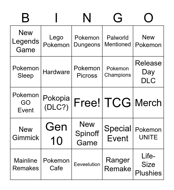 This bingo card has a free space and 24 words: Gen 10, Pokemon Cafe, Pokemon Picross, Mainline Remakes, New Pokemon, New Legends Game, Pokemon Sleep, Lego Pokemon, TCG, New Spinoff Game, Pokemon Champions, Pokemon GO Event, Special Event, Pokemon UNITE, Hardware, Ranger Remake, Merch, Pokemon Dungeons, Release Day DLC, Pokopia (DLC?), Life-Size Plushies, New Gimmick, Palworld Mentioned and Eeveelution.
