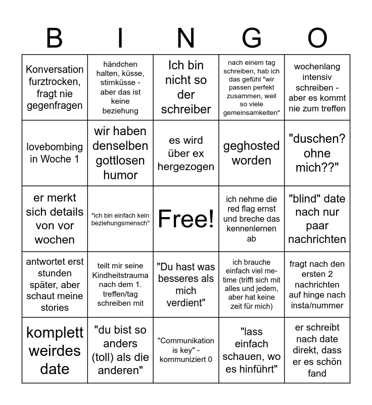 This bingo card has a free space and 24 words: teilt mir seine Kindheitstrauma nach dem 1. treffen/tag schreiben mit, "du bist so anders (toll) als die anderen", es wird über ex hergezogen, komplett weirdes date, wochenlang intensiv schreiben - aber es kommt nie zum treffen, Konversation furztrocken, fragt nie gegenfragen, lovebombing in Woche 1, händchen halten, küsse, stirnküsse - aber das ist keine beziehung, ich nehme die red flag ernst und breche das kennenlernen ab, "Du hast was besseres als mich verdient", geghosted worden, er merkt sich details von vor wochen, ich brauche einfach viel me-time (trifft sich mit alles und jedem, aber hat keine zeit für mich), fragt nach den ersten 2 nachrichten auf hinge nach insta/nummer, wir haben denselben gottlosen humor, "lass einfach schauen, wo es hinführt", "blind" date nach nur paar nachrichten, Ich bin nicht so der schreiber, "duschen? ohne mich??", "ich bin einfach kein beziehungsmensch", er schreibt nach date direkt, dass er es schön fand, antwortet erst stunden später, aber schaut meine stories, nach einem tag schreiben, hab ich das gefühl "wir passen perfekt zusammen, weil so viele gemeinsamkeiten" and "Communikation is key" - kommuniziert 0.