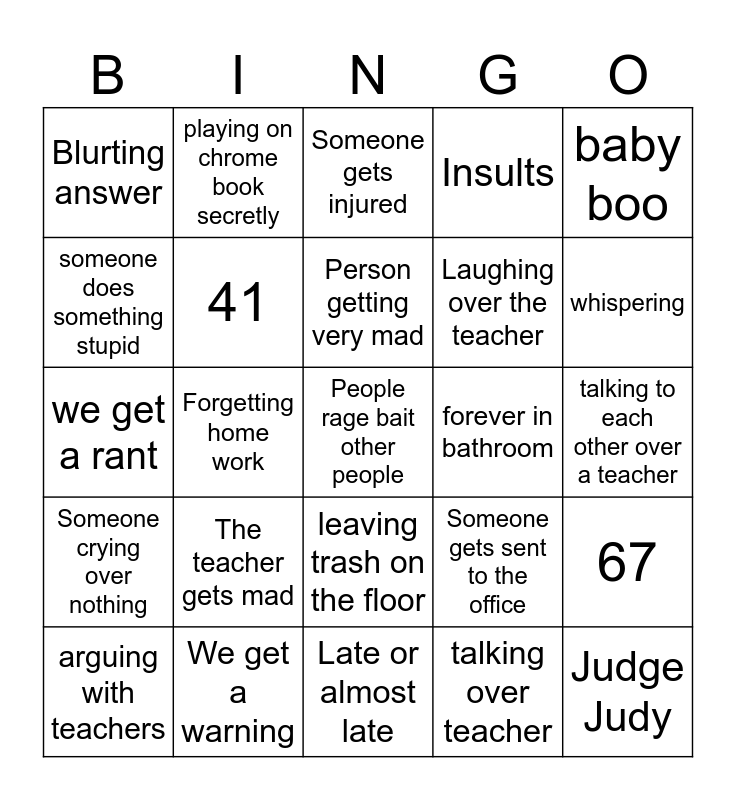This bingo card has a free space and 24 words: The teacher gets mad, We get a warning, Person getting very mad, arguing with teachers, baby boo, Blurting answer, someone does something stupid, playing on chrome book secretly, forever in bathroom, leaving trash on the floor, Laughing over the teacher, we get a rant, Someone gets sent to the office, 67, 41, talking over teacher, talking to each other over a teacher, Someone gets injured, whispering, Forgetting home work, Judge Judy, Someone crying over nothing, Insults and Late or almost late.