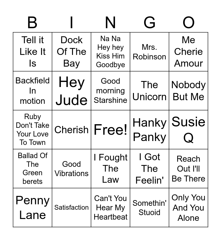 This bingo card has a free space and 75 words: Honky Tonk Woman, Dizzy, Na Na Hey hey Kiss Him Goodbye, Leaving On A Jet Plane, Sweet Caroline, Suspicious Minds, Build Me Up Buttercup, Proud Mary, One, Take A Letter Maria, Get Together, Spinning Wheel, Good morning Starshine, Backfield In motion, Stand By Me, Cherish, Hey Paula, Only You And You Alone, Time Of The Season, Me Cherie Amour, Put A Little Love In Your Heart, Ruby Don't Take Your Love To Town, Hey Jude, Dock Of The Bay, Mrs. Robinson, Young Girl, Dance To The Music, Spooky, Born To Be Wild, Yummy Yummy Yummy, Girl Watcher, Green Tambourine, Jumpin' Jack Flash, I Got The Feelin', Nobody But Me, The Unicorn, Revolution, Baby Now That I've Found You, Susie Q, Somethin' Stuoid, Apples Peaches Pumpkin Pie, Incense & Peppermints, Ruby Tuesday, All You Need Is Love, Brown Eyed Girl, Jimmy Mack, Penny Lane, Tell it Like It Is, Snoopy Vs The Red Baron, Green Green Grass Of Home, Yellow Submarine, I Fought The Law, Dandy, Working In The Coal Mine, Don't Mess With Bill, The Pied Piper, Sloop John b, Uptight, The Sounds Of Silence, Cool Jerk, Good Vibrations, Devil With A Blue Dress On, Lil Red Riding Hood, You Keep Me Hangin' On, Lightnin' Strikes, Hanky Panky, These Boots Are Made For Walking, You Can't hurry Love, Last Train To Clarksville, Reach Out I'll Be There, Ballad Of The Green berets, Satisfaction, You've Lost That Lovin' Feelin', Can't You Hear My Heartbeat and The Birds & The Bees.