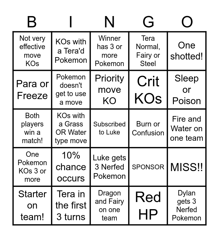 This bingo card has a free space and 24 words: 10% chance occurs, Tera in the first 3 turns, Priority move KO, Starter on team!, One shotted!, Not very effective move KOs, Para or Freeze, KOs with a Tera'd Pokemon, Burn or Confusion, Luke gets 3 Nerfed Pokemon, Crit KOs, Both players win a match!, SPONSOR, MISS!!, Pokemon doesn't get to use a move, Red HP, Fire and Water on one team, Winner has 3 or more Pokemon, Sleep or Poison, KOs with a Grass OR Water type move, Dylan gets 3 Nerfed Pokemon, One Pokemon KOs 3 or more, Tera Normal, Fairy or Steel and Dragon and Fairy on one team.