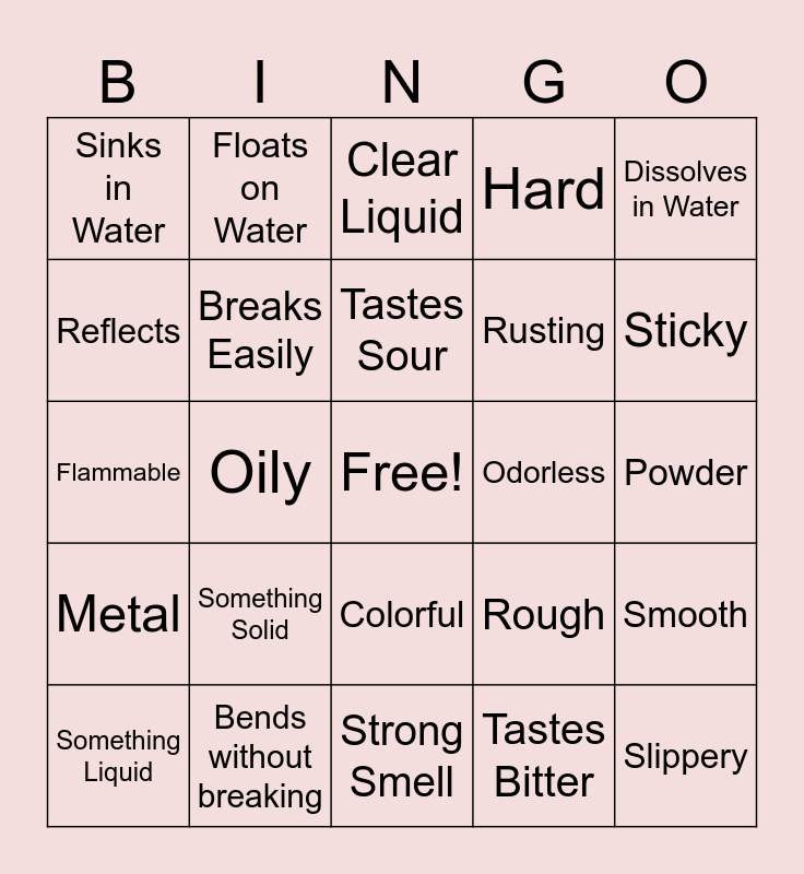 This bingo card has a free space and 24 words: Something Liquid, Something Solid, Tastes Sour, Tastes Bitter, Dissolves in Water, Sinks in Water, Floats on Water, Clear Liquid, Odorless, Powder, Flammable, Breaks Easily, Rough, Smooth, Reflects, Bends without breaking, Strong Smell, Hard, Sticky, Metal, Oily, Colorful, Rusting and Slippery.