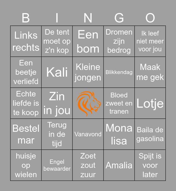 This bingo card has a free space and 24 words: Terug in de tijd, Engel bewaarder, Kleine jongen, huisje op wielen, Ik leef niet meer voor jou, Links rechts, Een beetje verliefd, De tent moet op z'n kop, Bloed zweet en tranen, Vanavond, Blikkendag, Echte liefde is te koop, Mona lisa, Baila de gasolina, Kali, Amalia, Lotje, Een bom, Maak me gek, Zin in jou, Spijt is voor later, Bestel mar, Dromen zijn bedrog and Zoet zout zuur.