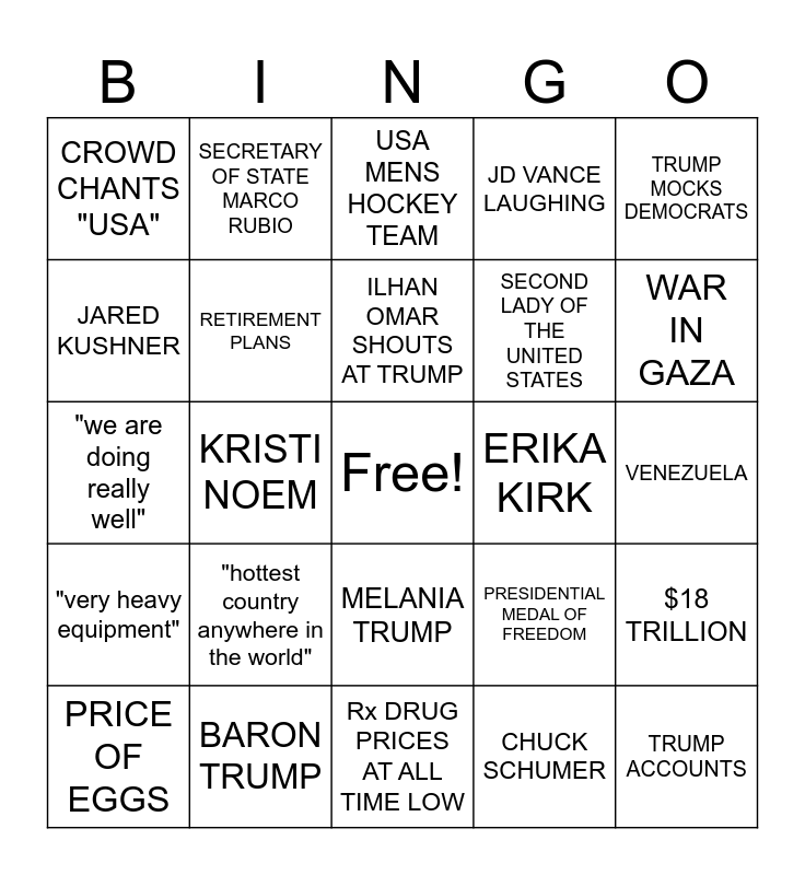 This bingo card has a free space and 29 words: PRICE OF EGGS, "end deadly sanctuary cities", KRISTI NOEM, 70,000 NEW CONSTRUCTION JOBS, CROWD CHANTS "USA", USA MENS HOCKEY TEAM, RETIREMENT PLANS, "hottest country anywhere in the world", ERIKA KIRK, BARON TRUMP, VENEZUELA, TRUMP ACCOUNTS, Rx DRUG PRICES AT ALL TIME LOW, CHUCK SCHUMER, WAR IN GAZA, TRUMP TALKS ABOUT GENDERS, MELANIA TRUMP, "very heavy equipment", TRUMP MOCKS DEMOCRATS, "we are doing really well", PRESIDENTIAL MEDAL OF FREEDOM, LEGION OF MERIT FOR EXTRAORDINARY HEROISM, SECOND LADY OF THE UNITED STATES, JARED KUSHNER, JD VANCE LAUGHING, SECRETARY OF STATE MARCO RUBIO, $18 TRILLION, ILHAN OMAR SHOUTS AT TRUMP and FREE.