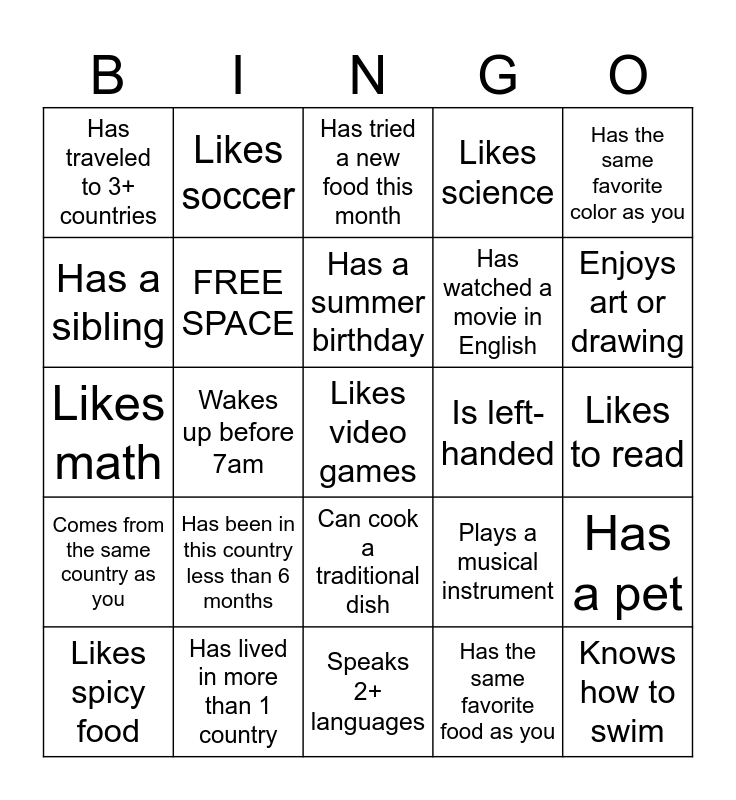 This bingo card has 25 words: Has been in this country less than 6 months, Speaks 2+ languages, Has a summer birthday, Likes spicy food, Has the same favorite color as you, Has traveled to 3+ countries, Has a sibling, Likes soccer, Is left-handed, Can cook a traditional dish, Has watched a movie in English, Likes math, Plays a musical instrument, Has a pet, FREE SPACE, Knows how to swim, Likes to read, Has tried a new food this month, Enjoys art or drawing, Wakes up before 7am, Likes video games, Has lived in more than 1 country, Comes from the same country as you, Likes science and Has the same favorite food as you.
