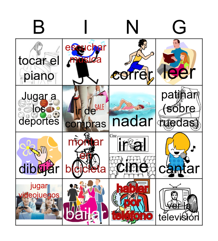 This bingo card has 16 images and 16 words: bailar, cantar, correr, tocar el piano, dibujar, escuchar música, ir al cine, hablar por teléfono, Jugar a los deportes, ir de compras, jugar videojuegos, leer, montar en bicicleta, patinar (sobre ruedas), nadar and ver la televisión.