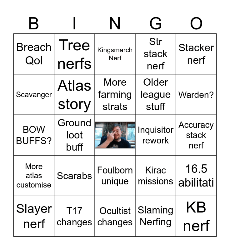 This bingo card has a free space and 24 words: Scarabs, T17 changes, More farming strats, Slayer nerf, Stacker nerf, Breach Qol, Scavanger, Tree nerfs, Inquisitor rework, Foulborn unique, Older league stuff, BOW BUFFS?, Kirac missions, 16.5 abilitati, Atlas story, Slaming Nerfing, Accuracy stack nerf, Kingsmarch Nerf, Warden?, Ground loot buff, KB nerf, More atlas customise, Str stack nerf and Ocultist changes.