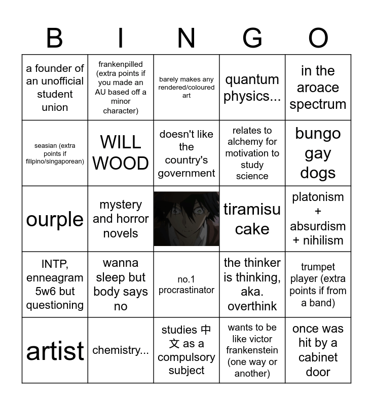 This bingo card has a free space and 24 words: wanna sleep but body says no, chemistry..., doesn't like the country's government, artist, in the aroace spectrum, a founder of an unofficial student union, seasian (extra points if filipino/singaporean), frankenpilled (extra points if you made an AU based off a minor character), tiramisu cake, no.1 procrastinator, relates to alchemy for motivation to study science, ourple, the thinker is thinking, aka. overthink, trumpet player (extra points if from a band), WILL WOOD, wants to be like victor frankenstein (one way or another), platonism + absurdism + nihilism, barely makes any rendered/coloured art, bungo gay dogs, mystery and horror novels, once was hit by a cabinet door, INTP, enneagram 5w6 but questioning, quantum physics... and studies 中文 as a compulsory subject.