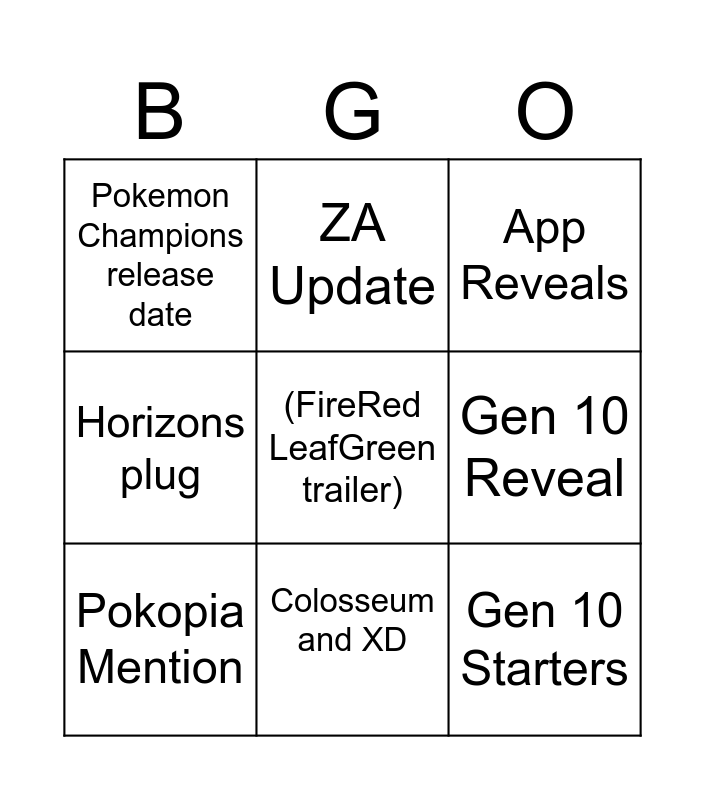 This bingo card has a free space and 8 words: Gen 10 Reveal, App Reveals, ZA Update, Pokopia Mention, Pokemon Champions release date, Gen 10 Starters, Horizons plug and Colosseum and XD.