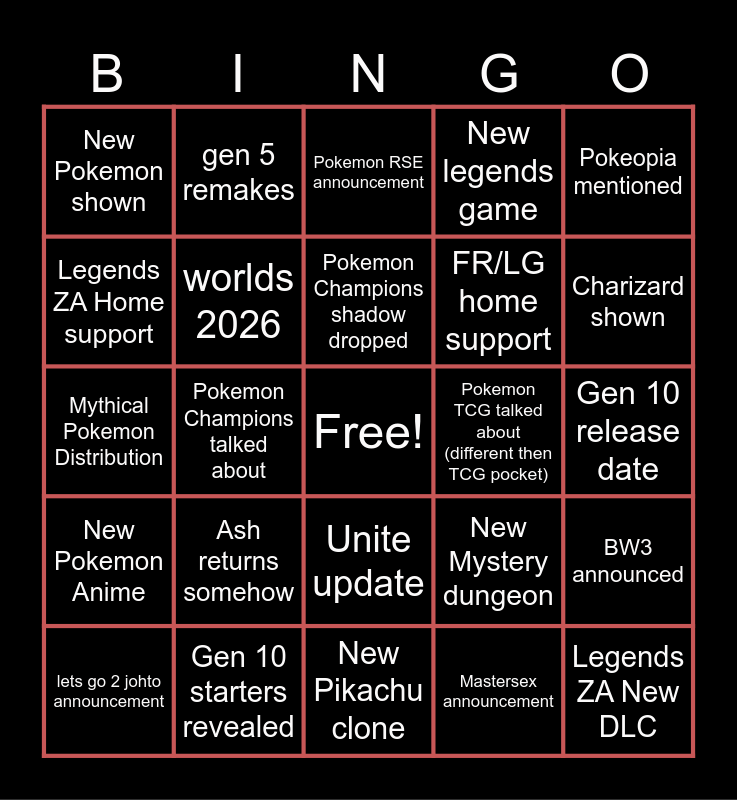 This bingo card has a free space and 34 words: Gen 10 announcment, Mastersex announcement, POGO announcement, Pocket TCG announcement, New Pokemon Anime, worlds 2026, Pokeopia mentioned, lets go 2 johto announcement, gen 5 remakes, Pokepark mentioned, Pokemon Champions shadow dropped, Pokemon RSE announcement, XD/Gale of darkness release date, New Pokemon Stadium, Pokemon TCG talked about (different then TCG pocket), Charizard shown, Gen 10 starters revealed, Mythical Pokemon Distribution, Ash returns somehow, New Mystery dungeon, Unite update, New spinoff game, New Pokemon shown, Gen 10 release date, New Pikachu clone, Legends ZA New DLC, New legends game, New switch 2 edition, FR/LG home support, Legends ZA Home support, New Pokemon Netflix series, Pokemon Champions talked about, BW3 announced and Kanto remake.