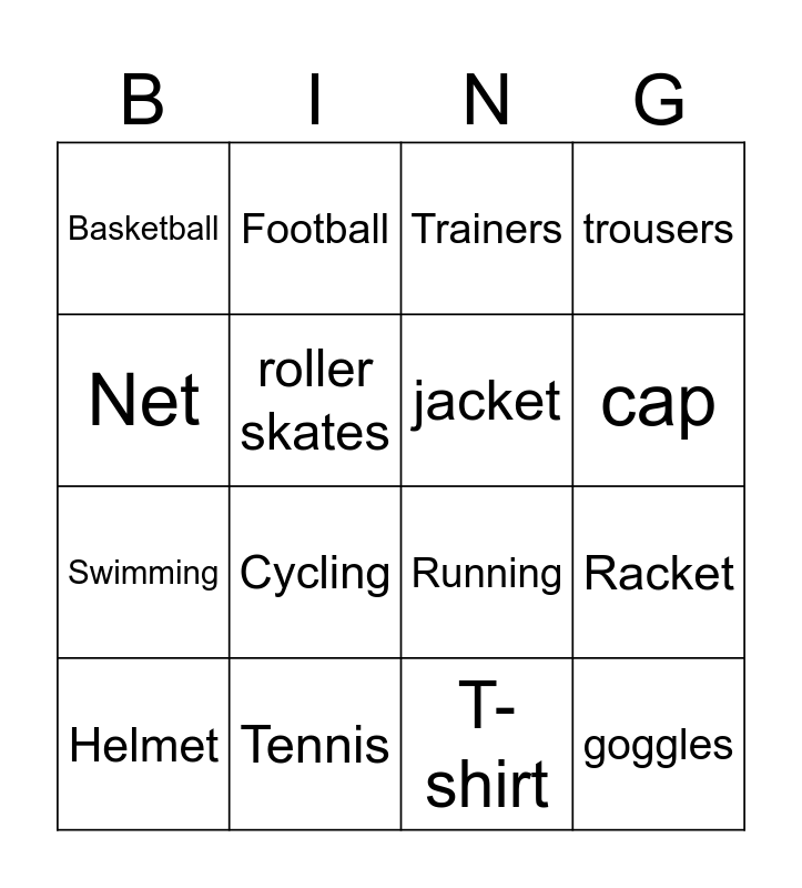 This bingo card has 20 words: Racket, Ball, Trainers, Swimsuit, Helmet, Net, Tennis, Basketball, Swimming, Football, Cycling, Running, roller skates, goggles, jacket, socks, cap, trousers, T-shirt and coat.