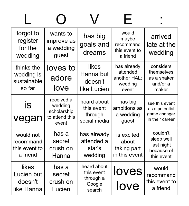 This bingo card has a free space and 24 words: has a secret crush on Hanna, has a secret crush on Lucien, likes Hanna but doesn't like Lucien, likes Lucien but doesn't like Hanna, arrived late at the wedding, forgot to register for the wedding, thinks the wedding is sustainable so far, wants to improve as a wedding guest, has big ambitions as a wedding guest, has already attended a star's wedding, has already attended another HAL: wedding event, is vegan, is excited about taking part in this event, couldn't sleep well last night because of this event, loves to adore love, loves love, see this event as a potential game changer in their career, has big goals and dreams, considers themselves as a shaker and/or a maker, received a wedding scholarship to attend this event, would recommand this event to a friend, would not recommand this event to a friend, would maybe recommand this event to a friend and heard about this event through a Google search.
