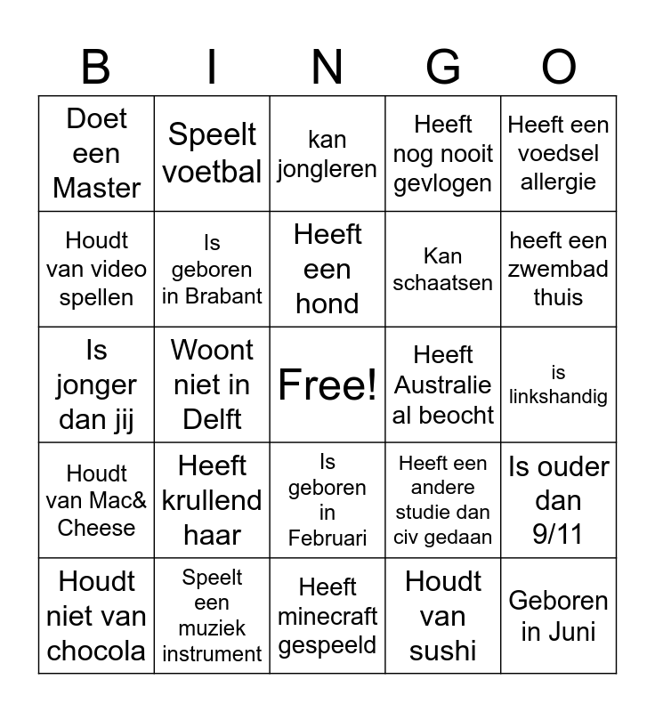 This bingo card has a free space and 24 words: Heeft krullend haar, Speelt een muziek instrument, Heeft een hond, Houdt niet van chocola, Heeft een voedsel allergie, Doet een Master, Houdt van video spellen, Speelt voetbal, Heeft Australie al beocht, Is geboren in Februari, Kan schaatsen, Is jonger dan jij, Heeft een andere studie dan civ gedaan, Is ouder dan 9/11, Is geboren in Brabant, Houdt van sushi, is linkshandig, kan jongleren, heeft een zwembad thuis, Woont niet in Delft, Geboren in Juni, Houdt van Mac& Cheese, Heeft nog nooit gevlogen and Heeft minecraft gespeeld.