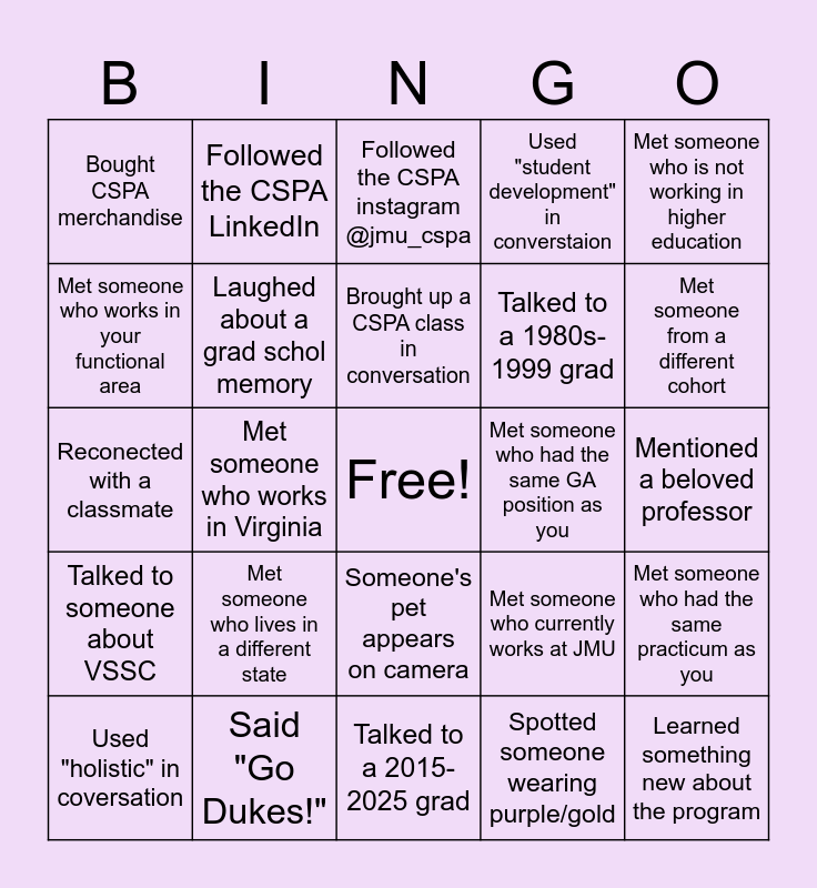 This bingo card has a free space and 27 words: Met someone who currently works at JMU, Talked to a 2000-2014 grad, Talked to a 1980s-1999 grad, Talked to a 2015-2025 grad, Met someone who works in your functional area, Followed the CSPA instagram @jmu_cspa, Followed the CSPA LinkedIn, Talked to someone about VSSC, Met someone who had the same GA position as you, Met someone who had the same practicum as you, Reconected with a classmate, Used "student development" in converstaion, Used "holistic" in coversation, Said "Go Dukes!", Met someone from a different cohort, Gave a career update, Laughed about a grad schol memory, Brought up a CSPA class in conversation, Met someone who lives in a different state, Bought CSPA merchandise, Mentioned a beloved professor, Spotted someone wearing purple/gold, Met someone who works in Virginia, Learned something new about the program, Someone's pet appears on camera, Met someone who is not working in higher education and Met a double duke.