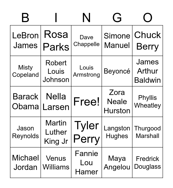 This bingo card has a free space and 49 words: Benjamin Banneker, Fredrick Douglass, Medgar Evers, Fannie Lou Hamer, Martin Luther King Jr, Malcom X, Rosa Parks, Marian Anderson, Misty Copeland, Dr Mae Jemison, Robert Louis Johnson, Simone Manuel, Thurgood Marshall, Langston Hughes, Tomi Adeyemi, Muhammad Ali, Louis Armstrong, Zora Neale Hurston, Simone Biles, Chuck Berry, Nella Larsen, Maya Angelou, LeBron James, Beyoncé, Audre Lorde, James Arthur Baldwin, Michael Jordan, Jesse Owens, Tyler Perry, Jason Reynolds, Octavia Bryant, Aretha Franklin, Lucille Clifton, Prince, Venus Williams, Sidney Poitier, Lonnie Johnson, Ralph Ellison, Phyllis Wheatley, Kobe Bryant, Charlie Parker, Ray Charles, Shonda Rhimes, Will Smith, Barack Obama, Dave Chappelle, Serena Williams, Deion Sanders and Mike Tyson.