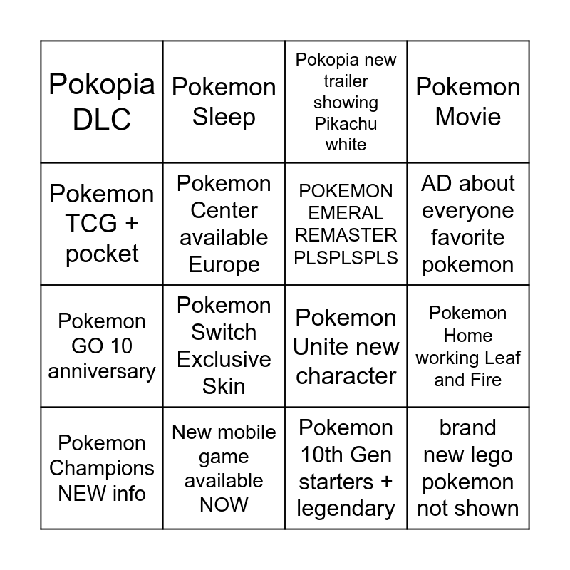 This bingo card has 16 words: New mobile game available NOW, Pokemon Home working Leaf and Fire, Pokopia new trailer showing Pikachu white, Pokopia DLC, Pokemon GO 10 anniversary, Pokemon Sleep, Pokemon Unite new character, Pokemon 10th Gen starters + legendary, Pokemon TCG + pocket, Pokemon Center available Europe, Pokemon Champions NEW info, Pokemon Movie, Pokemon Switch Exclusive Skin, AD about everyone favorite pokemon, POKEMON EMERAL REMASTER PLSPLSPLS and brand new lego pokemon not shown.