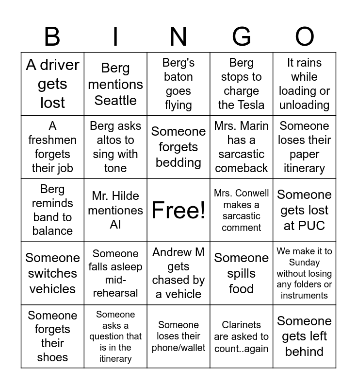 This bingo card has a free space and 30 words: Someone asks a question that is in the itinerary, Mr. Reeve identifies a bird from sound alone, Mr. Hilde mentiones AI, Mr. Snarr tells a dad joke, A driver gets lost, Berg's baton goes flying, Berg asks altos to sing with tone, Andrew M gets chased by a vehicle, Mrs. Conwell makes a sarcastic comment, Someone loses their phone/wallet, Someone gets lost at PUC, Someone gets left behind, Clarinets are asked to count..again, Plans change from the itinerary, Someone loses their paper itinerary, A guy loses/forgets his bowtie, Someone spills food, Someone switches vehicles, Someone falls asleep mid-rehearsal, It rains while loading or unloading, Berg reminds band to balance, We get stuck with an electric piano, Berg mentions Seattle, Mrs. Marin has a sarcastic comeback, A freshmen forgets their job, Berg stops to charge the Tesla, We make it to Sunday without losing any folders or instruments, Someone forgets their shoes, Someone forgets bedding and Mr. Westberg shows up with caffeine.