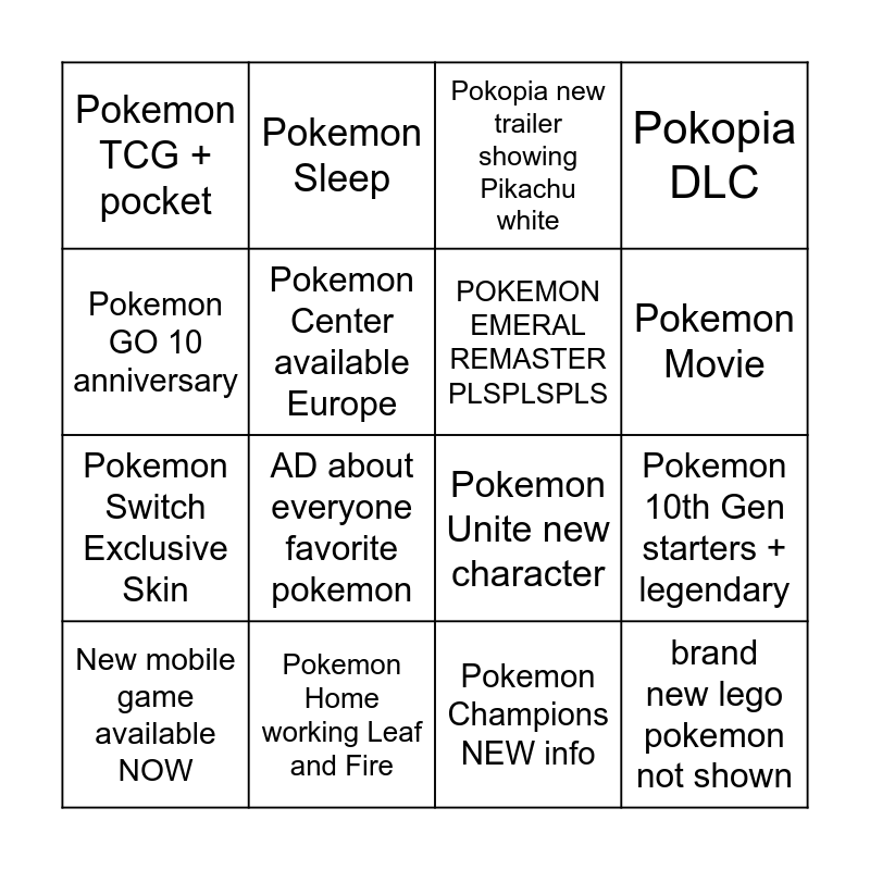This bingo card has 16 words: New mobile game available NOW, Pokemon Home working Leaf and Fire, Pokopia new trailer showing Pikachu white, Pokopia DLC, Pokemon GO 10 anniversary, Pokemon Sleep, Pokemon Unite new character, Pokemon 10th Gen starters + legendary, Pokemon TCG + pocket, Pokemon Center available Europe, Pokemon Champions NEW info, Pokemon Movie, Pokemon Switch Exclusive Skin, AD about everyone favorite pokemon, POKEMON EMERAL REMASTER PLSPLSPLS and brand new lego pokemon not shown.
