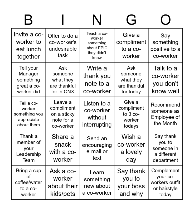 This bingo card has a free space and 24 words: Bring a cup of coffee/water to a co-worker, Share a snack with a co-worker, Write a thank you note to a co-worker, Say thank you to your boss and why, Say something positive to a co-worker, Invite a co-worker to eat lunch together, Offer to do a co-worker's undesirable task, Teach a co-worker something about EPIC they didn't know, Give a compliment to 3 co-worker todays, Recommend someone as Employee of the Month, Tell a co-worker something you appreciate about them, Ask someone what they are thankful for in CNX, Wish a co-worker a lovely day, Say thank you to someone in a different department, Tell your Manager something great a co-worker did, Ask a co-worker about their kids/pets, Learn something new about a co-worker, Give a compliment to a co-worker, Talk to a co-worker you don't know well, Thank a member of your Leadership Team, Leave a compliment on a sticky note for a co-worker, Send an encouraging e-mail or text, Ask someone what they are thankful for today and Complement your co-workers outfit or hairstyle today.