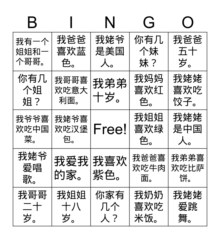 This bingo card has a free space and 24 words: 我爱我的家。, 我姐姐十八岁。, 我弟弟十岁。, 我哥哥二十岁。, 我爸爸五十岁。, 我有一个姐姐和一个哥哥。, 你有几个姐姐?, 我爸爸喜欢蓝色。, 我姐姐喜欢绿色。, 我喜欢紫色。, 我妈妈喜欢红色。, 我爷爷喜欢吃中国菜。, 我爸爸喜欢吃牛肉面。, 我弟弟喜欢吃比萨饼。, 我哥哥喜欢吃意大利面。, 我奶奶喜欢吃米饭。, 我姥姥是中国人。, 我姥爷是美国人。, 我姥姥喜欢吃饺子。, 我姥爷喜欢吃汉堡包。, 我姥姥爱跳舞。, 我姥爷爱唱歌。, 你有几个妹妹? and 你家有几个人?.