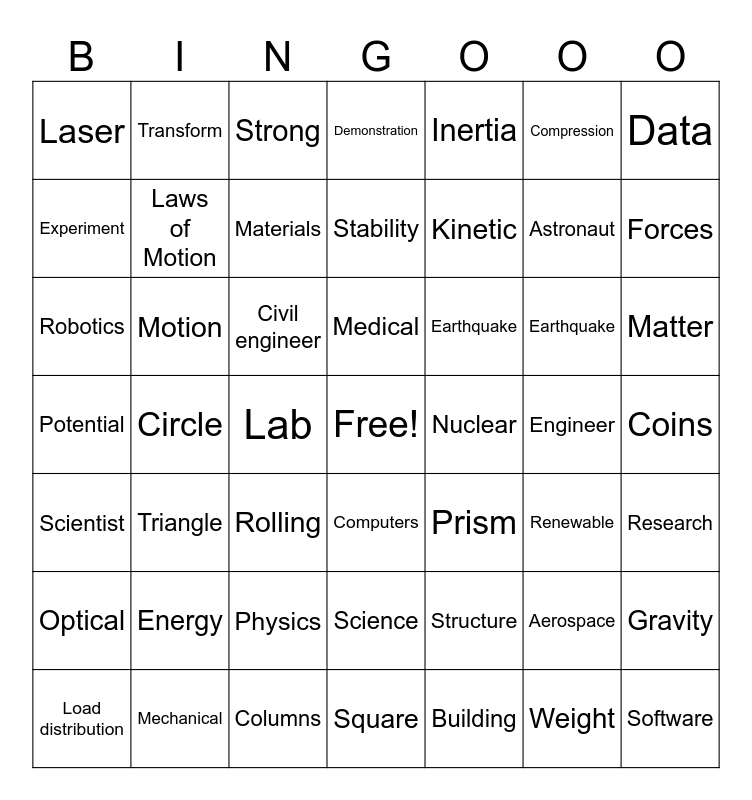 This bingo card has a free space and 49 words: Aerospace, Astronaut, Building, Circle, Civil engineer, Coins, Transform, Columns, Compression, Computers, Data, Demonstration, Earthquake, Earthquake, Energy, Engineer, Experiment, Forces, Gravity, Inertia, Kinetic, Lab, Laser, Laws of Motion, Load distribution, Materials, Matter, Mechanical, Medical, Motion, Newton, Nuclear, Optical, Physics, Potential, Prism, Renewable, Research, Robotics, Rolling, Science, Scientist, Software, Square, Stability, Strong, Structure, Triangle and Weight.