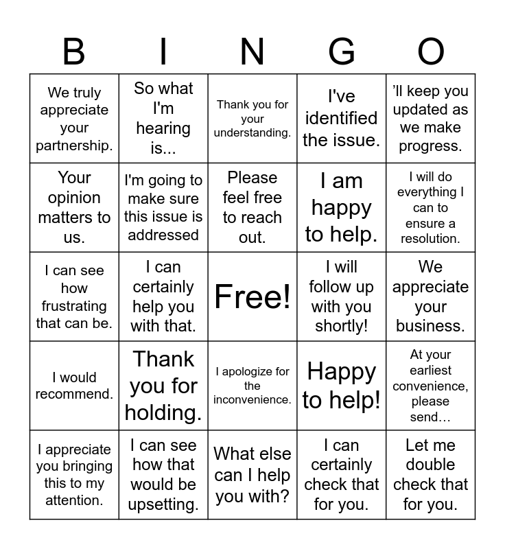 This bingo card has a free space and 34 words: I can do that for you., Great Question. I'll find that out for you., I will contact you with an update by..., I'm sorry you are going through this., We appreciate your business., Your opinion matters to us., I'm going to make sure this issue is addressed, What else can I help you with?, I am happy to help., Let me double check that for you., I can see how frustrating that can be., So what I'm hearing is..., I can certainly check that for you., Thank you for your patience., I would recommend., I can certainly help you with that., I apologize for the inconvenience., I will follow up with you shortly!, At your earliest convenience, please send…, I appreciate you bringing this to my attention., I can see how that would be upsetting., Thank you for your collaboration on this matter., I've identified the issue., I will do everything I can to ensure a resolution., Please allow me a few minutes to review., Thank you for holding., Thank you for your understanding., Would you mind clarifying?, ’ll keep you updated as we make progress., We truly appreciate your partnership., Happy to assist further if anything else comes up., Please feel free to reach out., Happy to help! and Please let me know if there’s anything else you need..