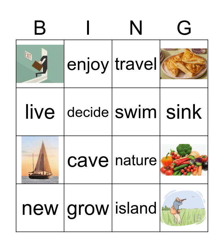 This bingo card has 5 images and 11 words: grow, travel, enjoy, nature, island, live, decide, new, cave, sink and swim.