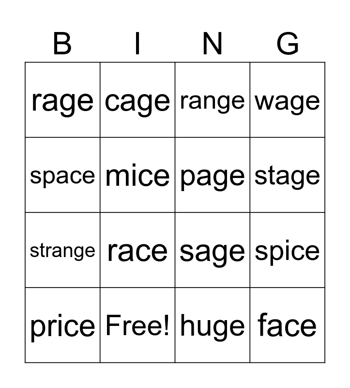 This bingo card has 21 words: Free!, age, cage, change, huge, page, rage, range, sage, stage, strange, wage, face, ice, mice, place, price, race, space, spice and twice.