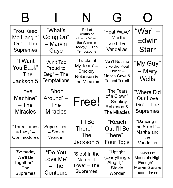 This bingo card has a free space and 50 words: “My Girl” – The Temptations, “Ain’t No Mountain High Enough” – Marvin Gaye & Tammi Terrell, “I Heard It Through the Grapevine” – Marvin Gaye, “Stop! In the Name of Love” – The Supremes, “Superstition” – Stevie Wonder, “Signed, Sealed, Delivered I’m Yours” – Stevie Wonder, “What’s Going On” – Marvin Gaye, “You Can’t Hurry Love” – The Supremes, “I Want You Back” – The Jackson 5, “ABC” – The Jackson 5, “Ain’t Too Proud to Beg” – The Temptations, “Heat Wave” – Martha and the Vandellas, “Dancing in the Street” – Martha and the Vandellas, “Reach Out I’ll Be There” – Four Tops, “Baby Love” – The Supremes, “Please Mr. Postman” – The Marvelettes, “Tracks of My Tears” – Smokey Robinson & The Miracles, “The Tears of a Clown” – Smokey Robinson & The Miracles, “Just My Imagination (Running Away with Me)” – The Temptations, “War” – Edwin Starr, “Shop Around” – The Miracles, “Uptight (Everything’s Alright)” – Stevie Wonder, “You Keep Me Hangin’ On” – The Supremes, “Ain’t Nothing Like the Real Thing” – Marvin Gaye & Tammi Terrell, “I Can’t Help Myself (Sugar Pie, Honey Bunch)” – Four Tops, “Love Child” – The Supremes, “My Guy” – Mary Wells, “Living for the City” – Stevie Wonder, “Ball of Confusion (That’s What the World Is Today)” – The Temptations, “I’ll Be There” – The Jackson 5, “Get Ready” – The Temptations, “Jimmy Mack” – Martha and the Vandellas, “You’re All I Need to Get By” – Marvin Gaye & Tammi Terrell, “The Love You Save” – The Jackson 5, “Do You Love Me” – The Contours, “Bernadette” – Four Tops, “I Wish It Would Rain” – The Temptations, “Cloud Nine” – The Temptations, “For Once in My Life” – Stevie Wonder, “Where Did Our Love Go” – The Supremes, “It Takes Two” – Marvin Gaye & Kim Weston, “You’ve Really Got a Hold on Me” – Smokey Robinson & The Miracles, “Nowhere to Run” – Martha and the Vandellas, “Ooo Baby Baby” – Smokey Robinson & The Miracles, “Someday We’ll Be Together” – The Supremes, “Love Machine” – The Miracles, “Neither One of Us (Wants to Be the First to Say Goodbye)” – Gladys Knight & the Pips, “Easy” – Commodores, “Three Times a Lady” – Commodores and “Brick House” – Commodores.