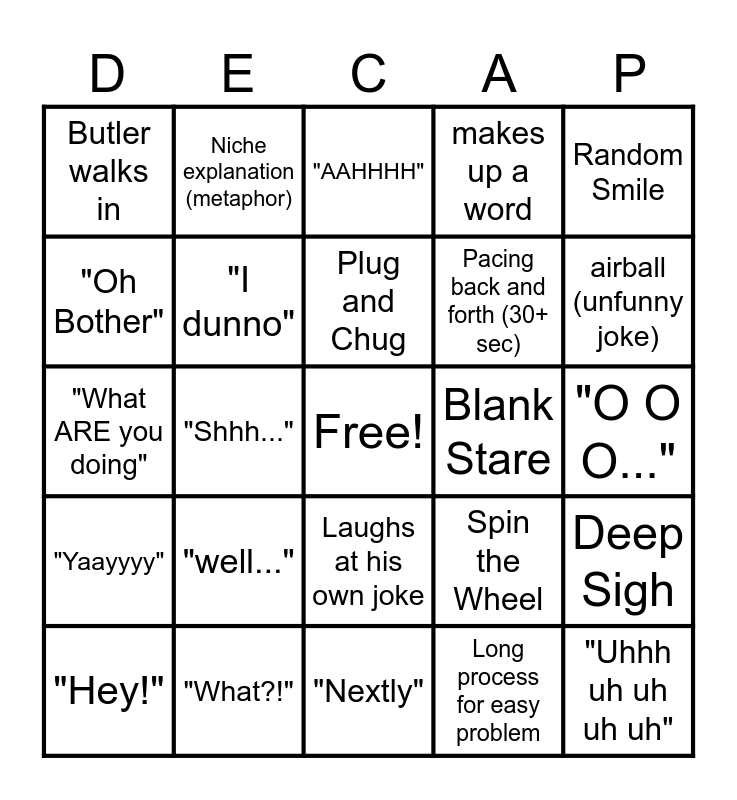 This bingo card has a free space and 24 words: "well...", "What?!", Plug and Chug, "Hey!", Random Smile, Butler walks in, "Oh Bother", Niche explanation (metaphor), Blank Stare, Laughs at his own joke, Pacing back and forth (30+ sec), "What ARE you doing", Spin the Wheel, Deep Sigh, "I dunno", Long process for easy problem, "O O O...", "AAHHHH", airball (unfunny joke), "Shhh...", "Uhhh uh uh uh uh", "Yaayyyy", makes up a word and "Nextly".