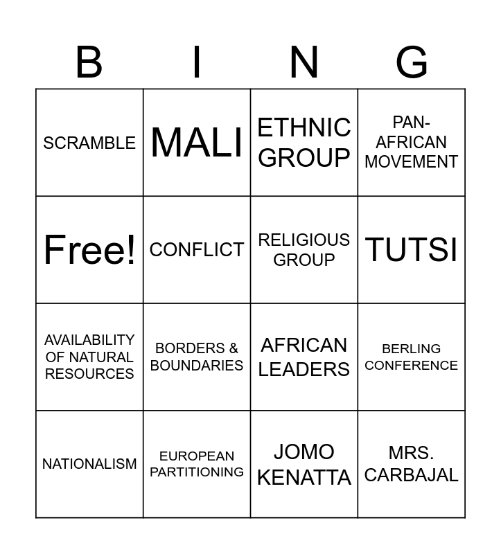 This bingo card has 16 words: EUROPEAN PARTITIONING, BERLING CONFERENCE, ETHNIC GROUP, SCRAMBLE, AVAILABILITY OF NATURAL RESOURCES, MALI, AFRICAN LEADERS, JOMO KENATTA, Free!, CONFLICT, NATIONALISM, PAN-AFRICAN MOVEMENT, BORDERS & BOUNDARIES, TUTSI, RELIGIOUS GROUP and MRS. CARBAJAL.