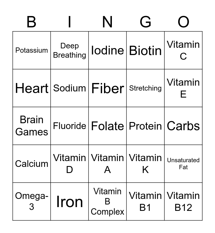 This bingo card has a free space and 24 words: Vitamin D, Iron, Fiber, Omega-3, Vitamin C, Potassium, Heart, Deep Breathing, Protein, Vitamin A, Stretching, Brain Games, Vitamin K, Unsaturated Fat, Sodium, Vitamin B1, Carbs, Iodine, Vitamin E, Fluoride, Vitamin B12, Calcium, Biotin and Vitamin B Complex.