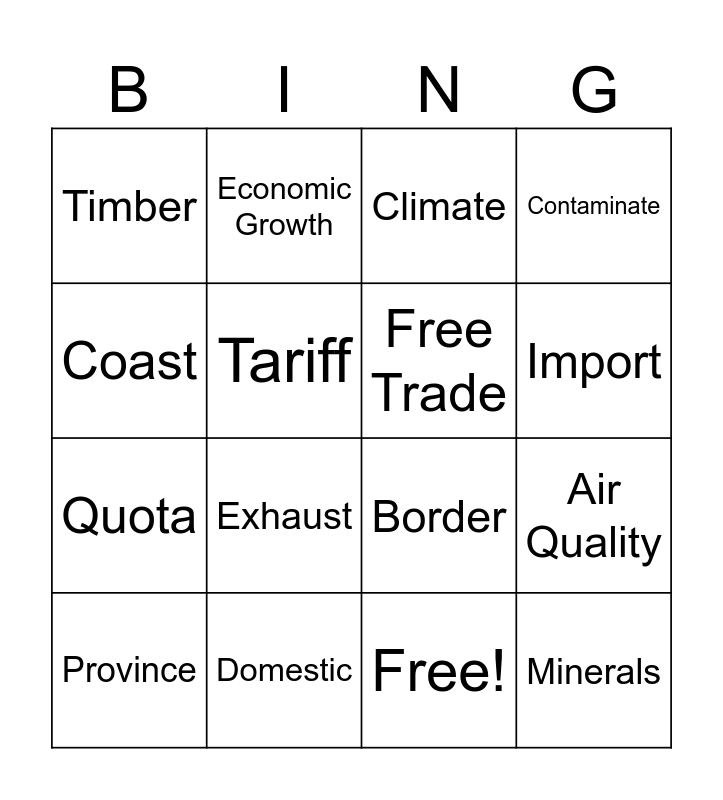 This bingo card has 17 words: Free!, Province, Climate, Timber, Exhaust, Contaminate, Air Quality, Free Trade, Import, Tariff, Domestic, Border, Coast, Economic Growth, Quota, Trade Balance and Minerals.
