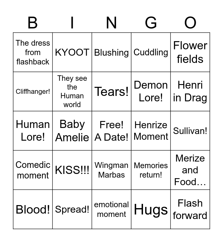 This bingo card has a free space and 25 words: KISS!!!, emotional moment, Tears!, Blood!, Flower fields, The dress from flashback, Cliffhanger!, KYOOT, Henrize Moment, Wingman Marbas, Demon Lore!, Human Lore!, Memories return!, Merize and Food…, They see the Human world, Narnia!, Sullivan!, Blushing, Henri in Drag, Baby Amelie, Flash forward, Spread!, Comedic moment, Cuddling and Hugs.