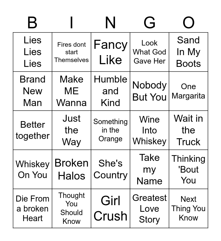 This bingo card has 47 words: Tennessee Whiskey, Something in the Orange, Wagon Wheel, Girl Crush, Broken Halos, Drunk on a plane, Fires dont start Themselves, T- Shirt, Brand New Man, Gold, Make ME Wanna, Look What God Gave Her, Thinking 'Bout You, Take my Name, Better Man, Night Shift, Humble and Kind, Wine Into Whiskey, Wild Ones, Sand In My Boots, Just the Way, Greatest Love Story, Lies Lies Lies, Nobody But You, Take you Kind, One Margarita, Die From a broken Heart, AA, She's Country, Whiskey On You, Like A Wrecking Ball, Where it Ends, Watermelon Moonshine, What Ifs, IF I Didn't Love You, Thought You Should Know, Wait in the Truck, 5 Foot 9, Burnin' it Down, Chasin' You, Next Thing You Know, Fancy Like, Better together, Dirt Road Anthem, Pretty Little Poison, Stick Season and She Had Me at Heads Carolina.